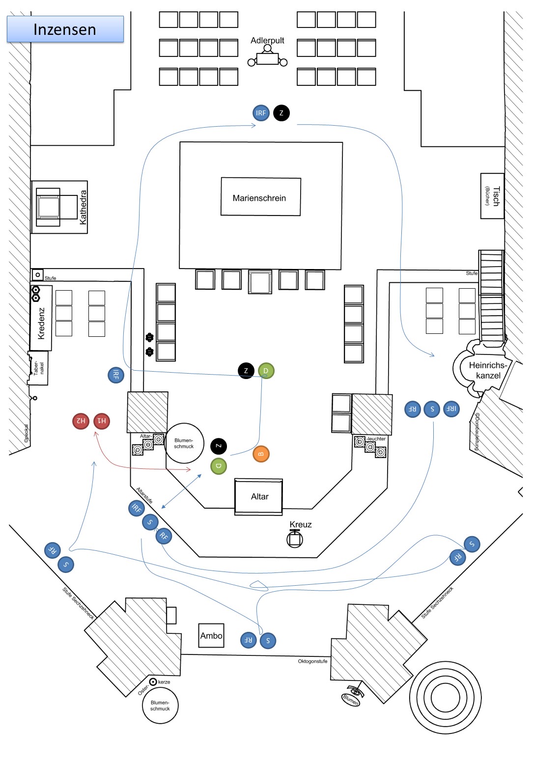 Prozessionsweg: Richtung Ambo am Altar vorbei bis vor die unterste Altarstufe. Dann links durch den unteren Altarraum Richtung Sakristei bis zum Beginn des Chorgestühls. Z schreitet voran, es folgen IRF/RF nebeneinander. Dahinter S, gefolgt von den Kerzenträgern und D. Um zu dieser Prozessionsordnung zu gelangen, muss S, bevor er loszieht, einen Schritt nach links machen und den hinter sich stehenden IRF durchlassen, die Kerzen müssen, durch kurze Verzögerung ihrerseits, dann Platz für S in der Prozession bilden. Auf Höhe des Marienschreins schreitet Z in einer ausladenden Kurve nach rechts und kommt vor der Heinrichskredenz zum Stehen. Hinter ihm haben IRF und RF, dahinter S diese Kurve nachvollzogen. IRF kommt neben Z, RF ca. auf Höhe des Eingangs Chorgestühl zum Stehen, sodass zwischen IRF und RF Platz für S bleibt. S nimmt diesen Platz ein, indem es hinter RF her in die Lücke zieht. Z, IRF, S und RF drehen sich Richtung Oktogon. IRF gibt das Rauchfass an Z weiter. Währenddessen bleiben die Kerzen parallel zur Stufe Marienschrein stehen, s. Anweisung Kerzengruppe. D steigt die Stufen zur Heinrichskanzel empor, Z folgt in gemessenem Abstand. Nach Inzens des Evangeliars verlässt Z die Heinrichskanzel und gibt das Rauchfass an IRF zurück. Während D nach Verkündung des Evangeliars die Stufen der Kanzel herabsteigt, begibt sich die Weihrauchgruppe auf unmittelbarem Weg zurück zum Weirauchständer an der Sakristeitür.