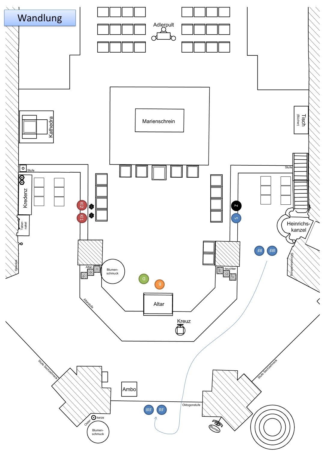 Zur Wandlung knien die Kerzenträger an den eingezeichneten Position bei den Schellen. Der Zeremoniar kniet üblicherweise gegenüber unterhalb der Heinrichskanzel, so dass er als gute Orientierung für den richtigen Zeitpunkt nach dem Ende des Sanctus und Benedictus dienen kann.