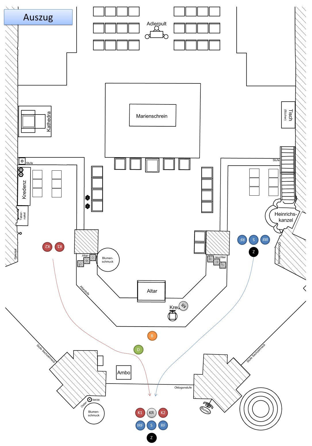 Nach dem Segen verlassen alle Ministranten ihre Sitzplätze. Die Kerzenträger nehmen sich selbstständig die Leuchter von der Kredenz und stellen sich vor der Säule auf, so dass sie Blickkontakt zu den übrigen Ministranten auf der Kanzelseite aufnehmen können. Sobald sich diese in Bewegung setzen gehen die Kerzenträger in Richtung Oktogon, siehe Skizze roter Pfeil: