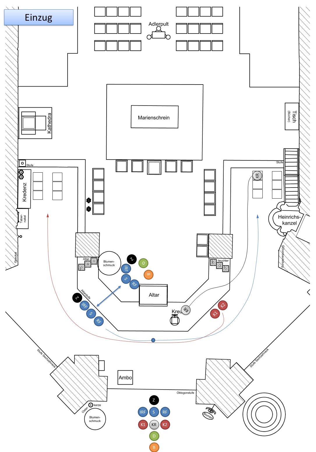 Zum Schluss einige Skizzen zur Übersicht über die Positionen während des Pontifikalamts. Sie wurden mit Hilfe dieser Powerpoint-Datei erstellt.