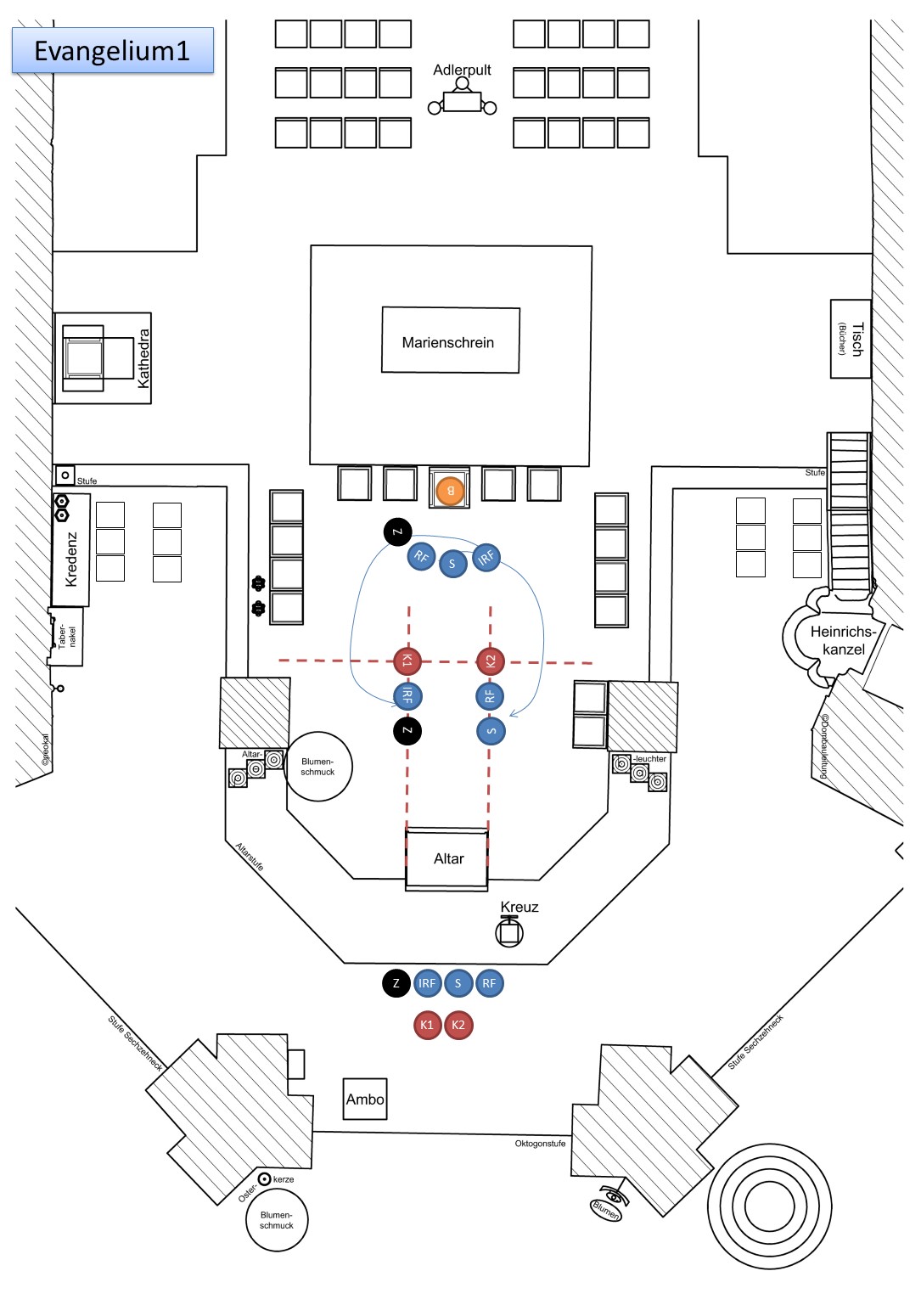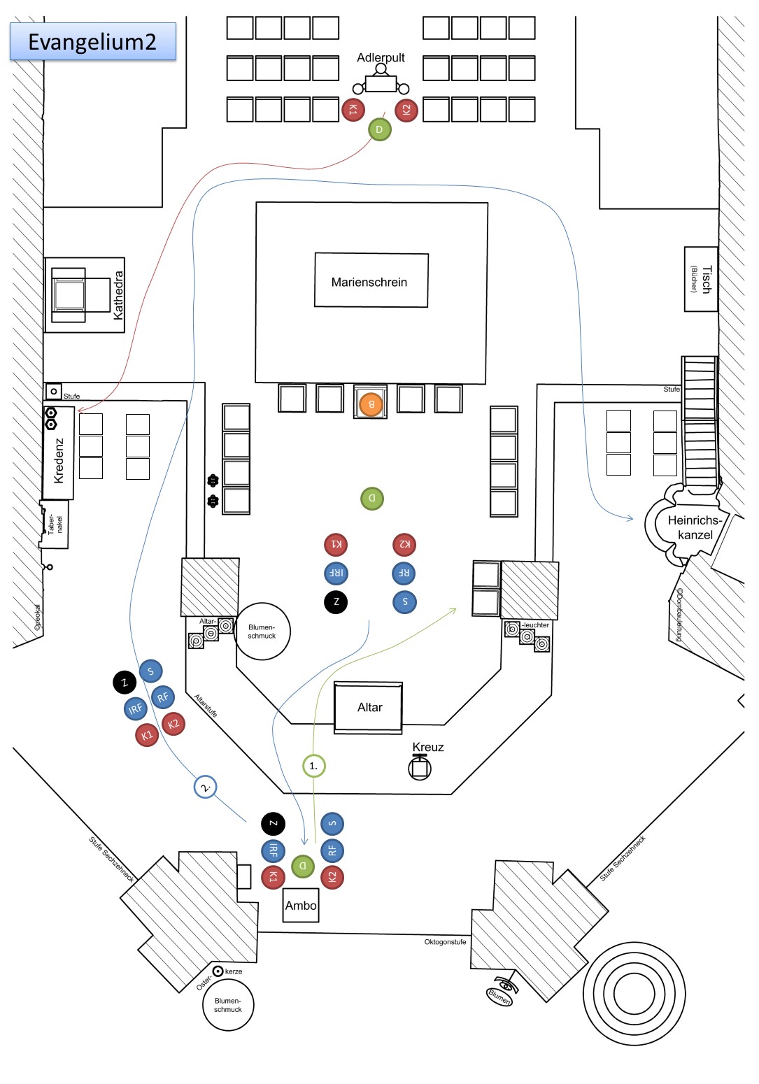 Ist die Chorhalle besetzt, trägt der Diakon das Evangeliar in die Chorhalle. Nach dem Evangelium formiert sich die Ministrantengruppe in bekannter Weise mit den Kerzenträgern am Schluss unmittelbar vor dem Diakon. Sie ziehen auf dem eingezeichneten Wege in die Chorhalle hinter den Marienschrein. Die beiden Kerzenträger folgen den Rauchfässern nur bis hintern Marienschrein, dann nehmen sie die in der Skizze dargestellten Positionen neben dem Adlerpult in der Chorhalle ein und schauen sich an. Sobald der Diakon das Evangeliar auf dem Adlerpult abgelegt und sich verneigt hat, gehen die Kerzen selbstständig auf dem mit einem roten Pfeil eingezeichneten Weg zurück zur Kredenz, stellen die Leuchter dort ab und gehen zurück auf ihre Plätze.