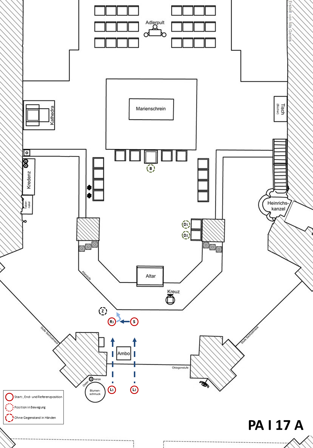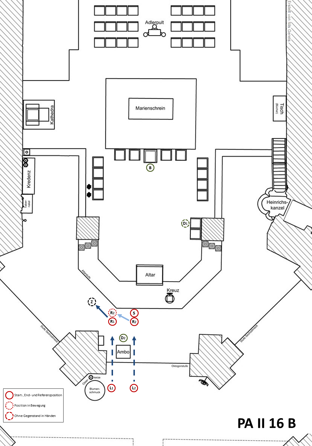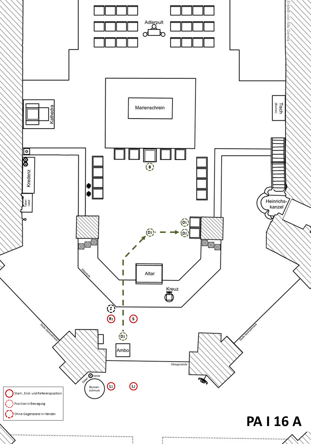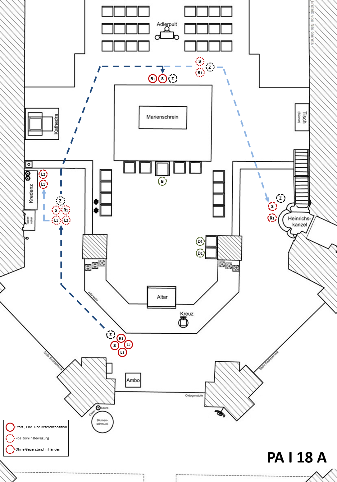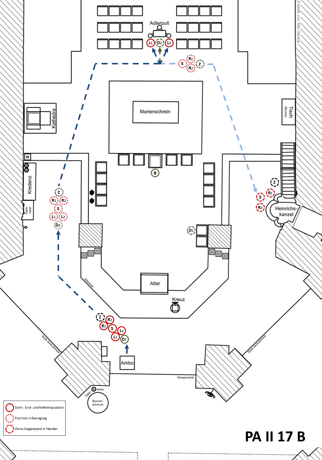 | Wird das Evangeliar nicht inthronisiert, so geht nach der Verkündigung des Evangeliums der Diakon auf direktem Weg zurück zu seinem Platz. Alle Ministranten kehren in Prozessionsordnung auf ihre Plätze zurück. Als erstes geht der Zeremoniar, es folgen paarweise Rauchfass- und Schiffchenträger und die beiden Leuchterträger. (Werden zwei Rauchfässer verwendet, so folgen die beiden Rauchfassträger zusammen dem Zeremoniar und der Schiffchenträger reiht sich vor den Leuchterträgern ein). Die gesamte Gruppe zieht in der beschriebenen Ordnung (paarweise) bis zur Kredenz (Tabernakelseite). Dort werden die Leuchter abgestellt. Der Zeremoniar und die Weihrauchgruppe gehen währenddessen hinter den Marienschrein, machen eine Verneigung (Reverenz) in Richtung Hauptaltar und kehren dann zum Bereich unterhalb der Heinrichskanzel zurück. Die Rauchfässer und das Schiffchen werden am Ständer deponiert. Dann kehren alle Ministranten zu ihren Plätzen zurück und setzen sich gleichzeitig hin. | Wird das Evangeliar inthronisiert, so wird eine Prozession gebildet. Als erstes geht der Zeremoniar, es folgen paarweise Rauchfass- und Schiffchenträger, dann die beiden Leuchterträger und schließlich der Diakon mit dem Evangeliar. (Werden zwei Rauchfässer verwendet, so folgen die beiden Rauchfassträger zusammen dem Zeremoniar und der Schiffchenträger reiht sich vor den beiden Leuchterträgern ein). Die gesamte Gruppe zieht in der beschriebenen Ordnung am Tabernakel vorbei in die Chorhalle. Der Zeremoniar und die Weihrauchgruppe gehen ohne eine Verneigung (Reverenz) weiter zum Bereich unterhalb der Heinrichskanzel. Die Rauchfässer und das Schiffchen werden dort am Ständer deponiert. Die Leuchterträger stellen sich währenddessen flankierend links und rechts vom Adlerpult auf, so dass sie einander zugewandt sind (ad invicem). Haben sie ihre Position am Adlerpult eingenommen, behalten sie die Leuchter in der Hand, die der Gemeinde in der Chorhalle zugewandt ist. Der Diakon legt das Evangeliar aufgeschlagen auf das Adlerpult und kehrt nach einer Verneigung (Reverenz) auf seinen Platz zurück. Erst nachdem der Diakon vom Adlerpult weggetreten ist, nehmen die Leuchterträger die Leuchter in die äußere Hand und begeben sich zur Kredenz (Tabernakelseite), wo sie die Leuchter abstellen. Dann kehren alle Ministranten zu ihren Plätzen zurück und setzen sich gleichzeitig hin. | Wird das Evangelium von der Heinrichskanzel verkündet, wird es immer auf dem Adlerpult inthronisiert. Sobald der Diakon mit dem Evangeliar die letzten Stufen der Heinrichskanzel herunterkommt, gehen Zeremoniar und Weihrauchgruppe gemeinsam auf direktem Weg zu ihren Plätzen unter der Heinrichskanzel, ggf. geht dabei der Zeremoniar vor. Die Leuchterträger schwenken gemeinsam nach links um und gehen vor dem Diakon, der das Evangeliar erhoben trägt, zum Adlerpult in der Chorhalle. Dort stellen sie sich flankierend links und rechts vom Adlerpult auf, so dass sie einander zugewandt sind (ad invicem). Haben sie ihre Position am Adlerpult eingenommen, behalten sie die Leuchter in der Hand, die der Gemeinde in der Chorhalle zugewandt ist. Der Diakon legt das Evangeliar aufgeschlagen auf das Adlerpult und kehrt nach einer Verneigung (Reverenz) auf seinen Platz zurück. Erst nachdem der Diakon vom Adlerpult weggetreten ist, nehmen die Leuchterträger die Leuchter in die äußere Hand und begeben sich zur Kredenz (Tabernakelseite), wo sie die Leuchter abstellen. Dann kehren alle Ministranten zu ihren Plätzen zurück und setzen sich gleichzeitig hin. |