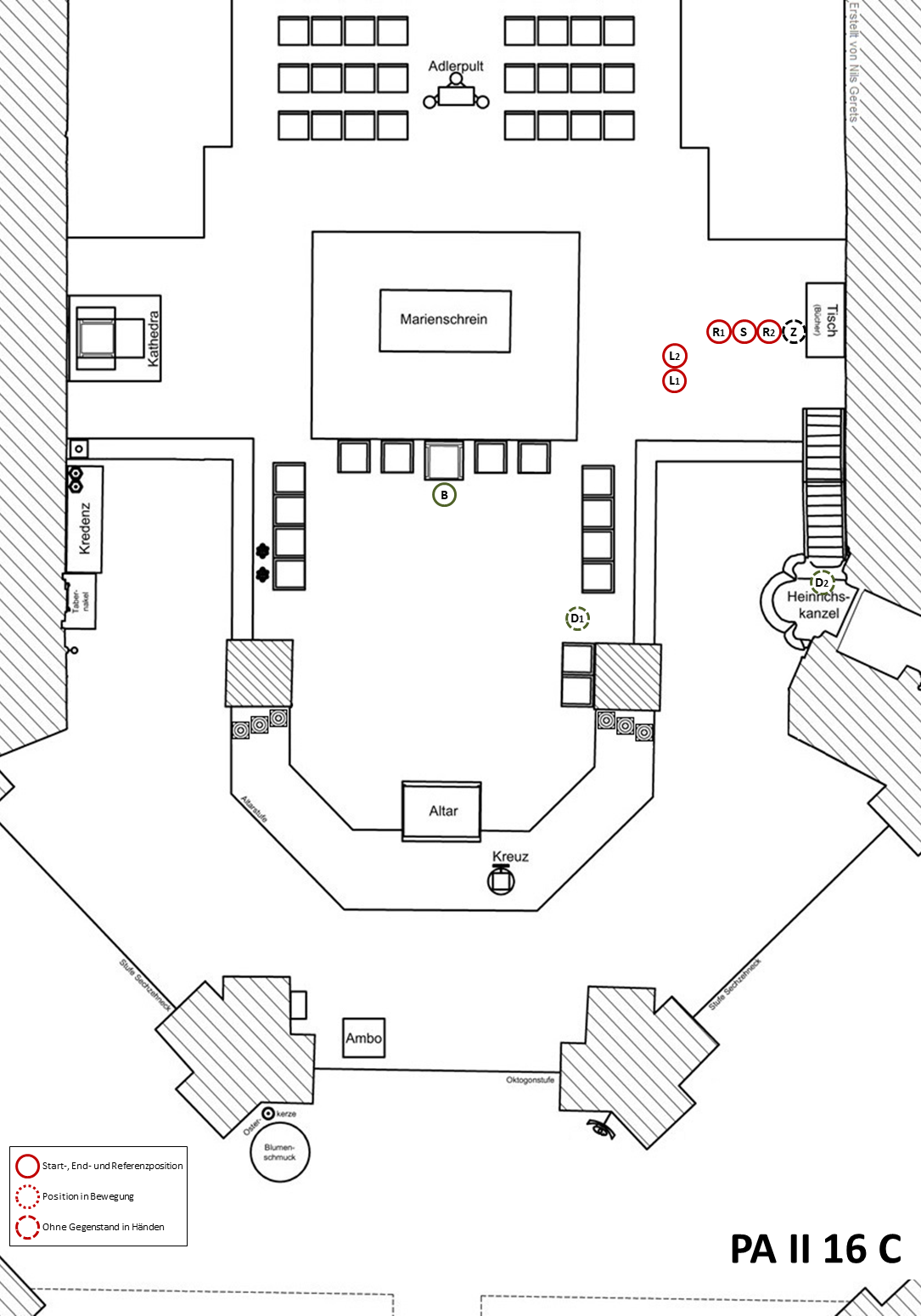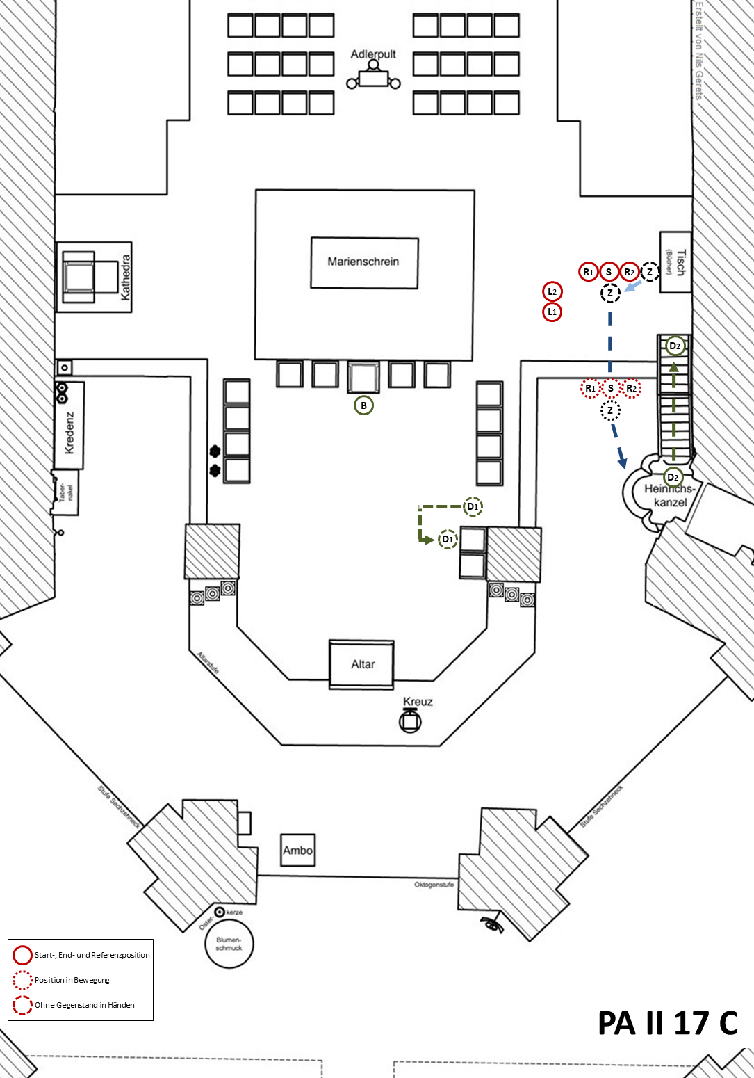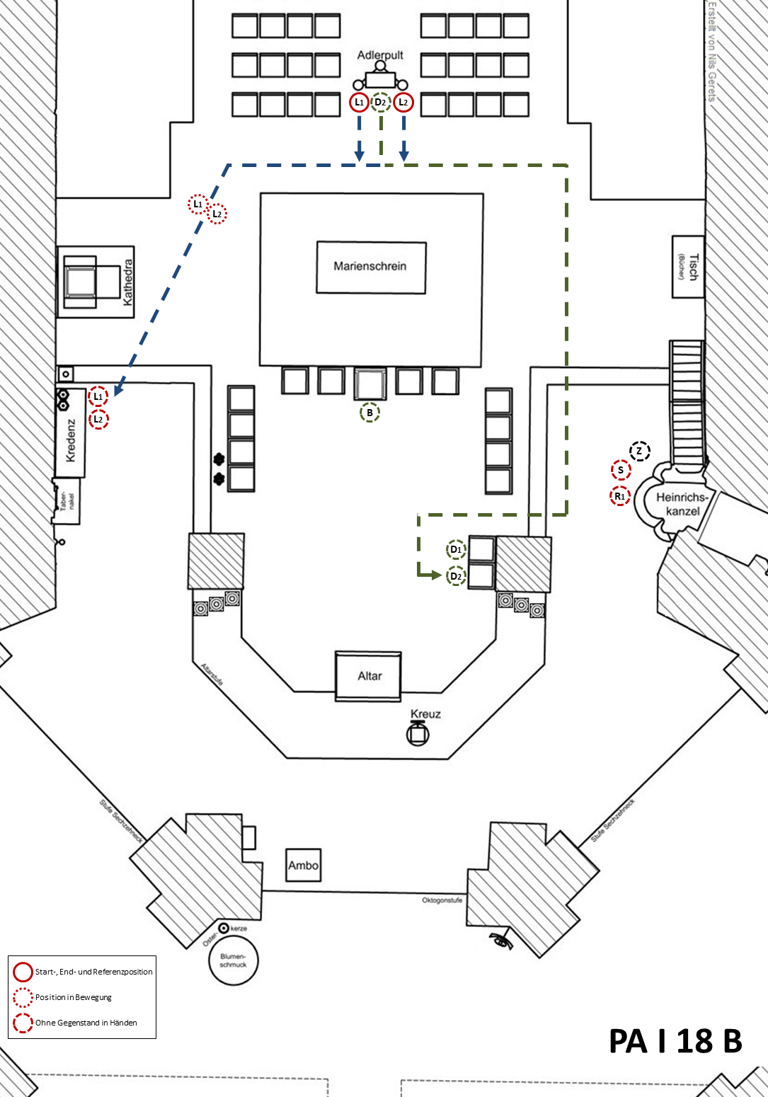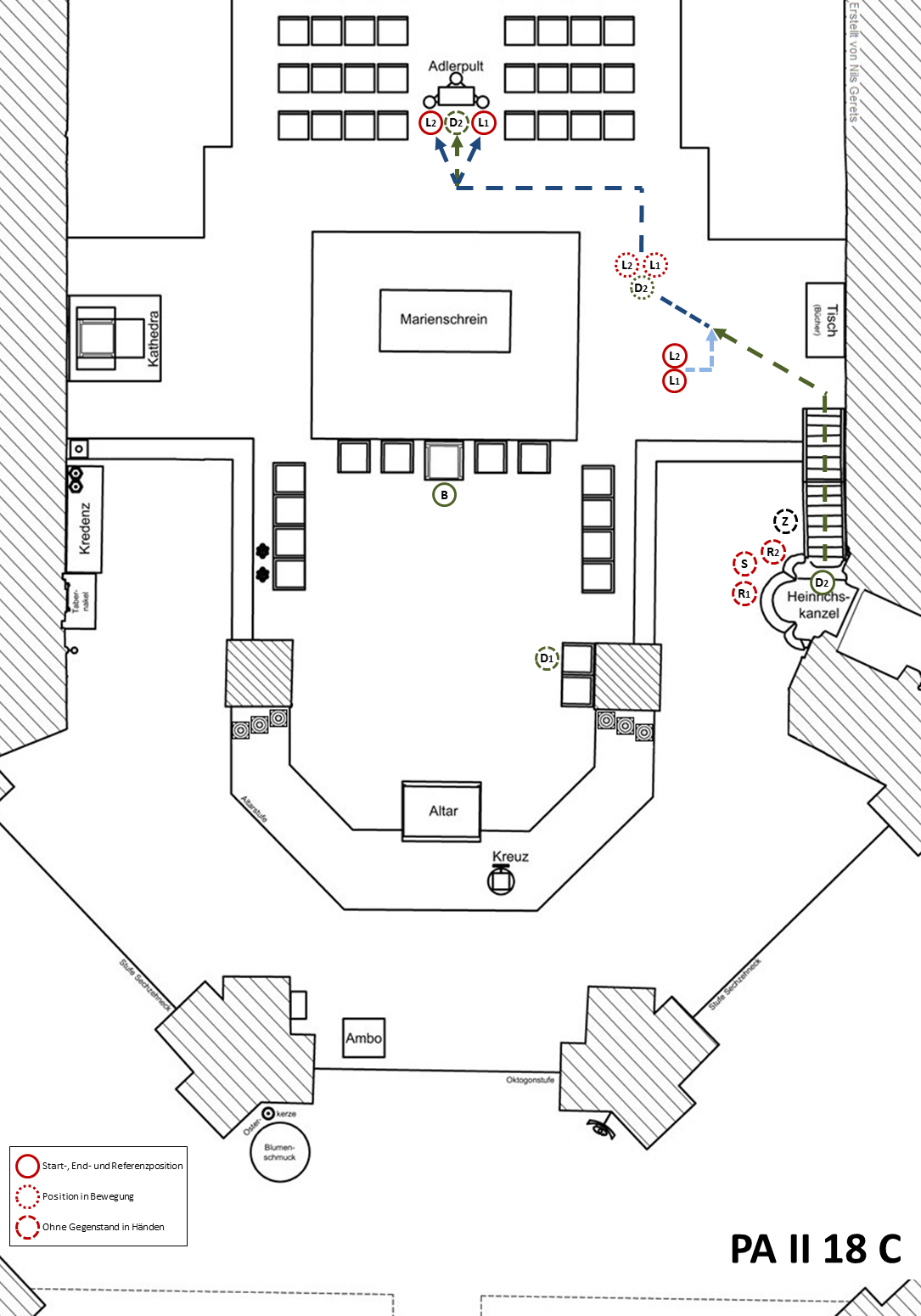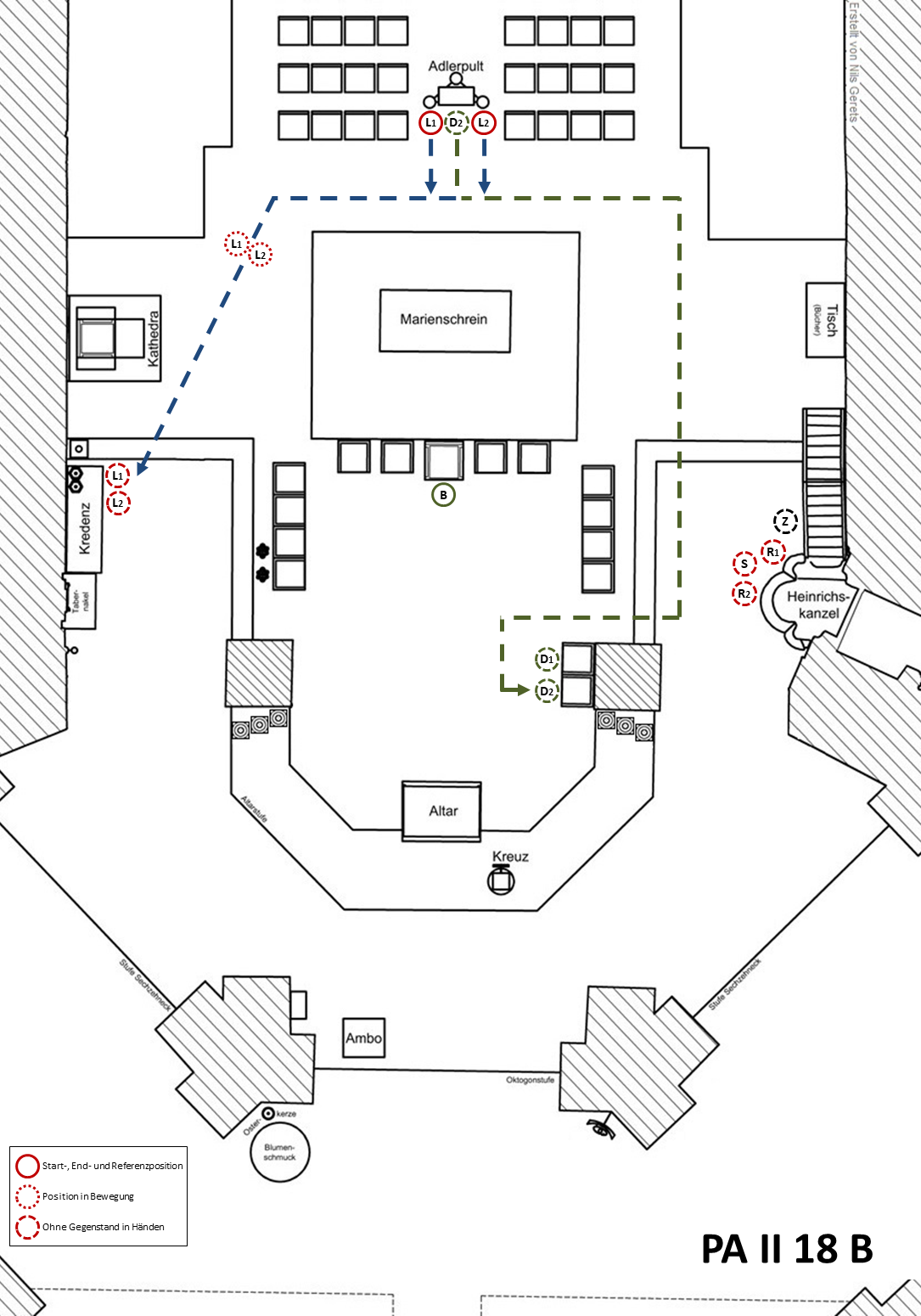 | Wird das Evangeliar nicht inthronisiert, so geht nach der Verkündigung des Evangeliums der Diakon auf direktem Weg zurück zu seinem Platz. Alle Ministranten kehren in Prozessionsordnung auf ihre Plätze zurück. Als erstes geht der Zeremoniar, es folgen paarweise Rauchfass- und Schiffchenträger und die beiden Leuchterträger. (Werden zwei Rauchfässer verwendet, so folgen die beiden Rauchfassträger zusammen dem Zeremoniar und der Schiffchenträger reiht sich vor den Leuchterträgern ein). Die gesamte Gruppe zieht in der beschriebenen Ordnung (paarweise) bis zur Kredenz (Tabernakelseite). Dort werden die Leuchter abgestellt. Der Zeremoniar und die Weihrauchgruppe gehen währenddessen hinter den Marienschrein, machen eine Verneigung (Reverenz) in Richtung Hauptaltar und kehren dann zum Bereich unterhalb der Heinrichskanzel zurück. Die Rauchfässer und das Schiffchen werden am Ständer deponiert. Dann kehren alle Ministranten zu ihren Plätzen zurück und setzen sich gleichzeitig hin. | Wird das Evangeliar inthronisiert, so wird eine Prozession gebildet. Als erstes geht der Zeremoniar, es folgen paarweise Rauchfass- und Schiffchenträger, dann die beiden Leuchterträger und schließlich der Diakon mit dem Evangeliar. (Werden zwei Rauchfässer verwendet, so folgen die beiden Rauchfassträger zusammen dem Zeremoniar und der Schiffchenträger reiht sich vor den beiden Leuchterträgern ein). Die gesamte Gruppe zieht in der beschriebenen Ordnung am Tabernakel vorbei in die Chorhalle. Der Zeremoniar und die Weihrauchgruppe gehen ohne eine Verneigung (Reverenz) weiter zum Bereich unterhalb der Heinrichskanzel. Die Rauchfässer und das Schiffchen werden dort am Ständer deponiert. Die Leuchterträger stellen sich währenddessen flankierend links und rechts vom Adlerpult auf, so dass sie einander zugewandt sind (ad invicem). Haben sie ihre Position am Adlerpult eingenommen, behalten sie die Leuchter in der Hand, die der Gemeinde in der Chorhalle zugewandt ist. Der Diakon legt das Evangeliar aufgeschlagen auf das Adlerpult und kehrt nach einer Verneigung (Reverenz) auf seinen Platz zurück. Erst nachdem der Diakon vom Adlerpult weggetreten ist, nehmen die Leuchterträger die Leuchter in die äußere Hand und begeben sich zur Kredenz (Tabernakelseite), wo sie die Leuchter abstellen. Dann kehren alle Ministranten zu ihren Plätzen zurück und setzen sich gleichzeitig hin. | Wird das Evangelium von der Heinrichskanzel verkündet, wird es immer auf dem Adlerpult inthronisiert. Sobald der Diakon mit dem Evangeliar die letzten Stufen der Heinrichskanzel herunterkommt, gehen Zeremoniar und Weihrauchgruppe gemeinsam auf direktem Weg zu ihren Plätzen unter der Heinrichskanzel, ggf. geht dabei der Zeremoniar vor. Die Leuchterträger schwenken gemeinsam nach links um und gehen vor dem Diakon, der das Evangeliar erhoben trägt, zum Adlerpult in der Chorhalle. Dort stellen sie sich flankierend links und rechts vom Adlerpult auf, so dass sie einander zugewandt sind (ad invicem). Haben sie ihre Position am Adlerpult eingenommen, behalten sie die Leuchter in der Hand, die der Gemeinde in der Chorhalle zugewandt ist. Der Diakon legt das Evangeliar aufgeschlagen auf das Adlerpult und kehrt nach einer Verneigung (Reverenz) auf seinen Platz zurück. Erst nachdem der Diakon vom Adlerpult weggetreten ist, nehmen die Leuchterträger die Leuchter in die äußere Hand und begeben sich zur Kredenz (Tabernakelseite), wo sie die Leuchter abstellen. Dann kehren alle Ministranten zu ihren Plätzen zurück und setzen sich gleichzeitig hin. |