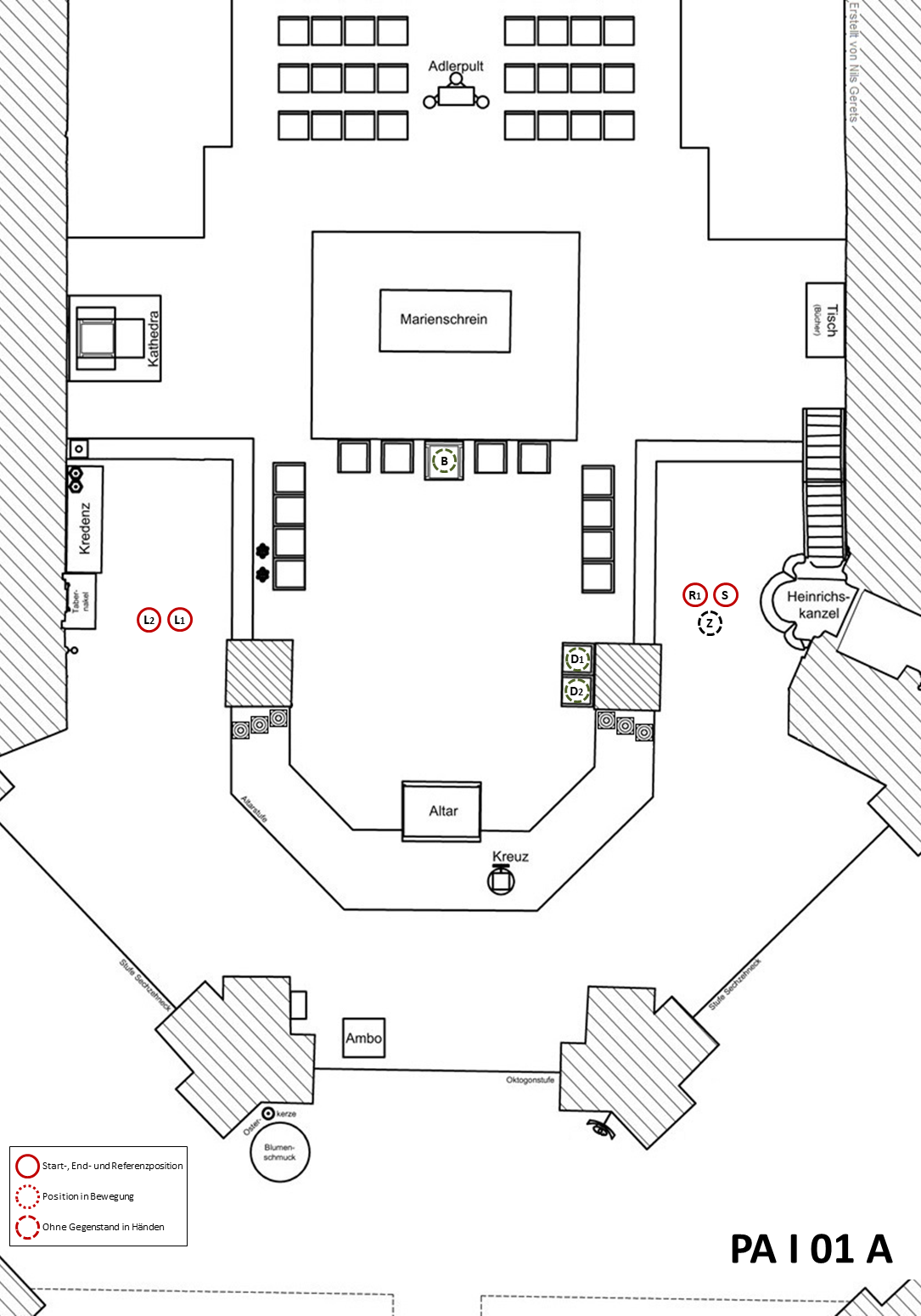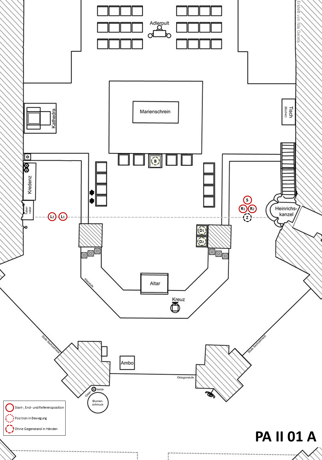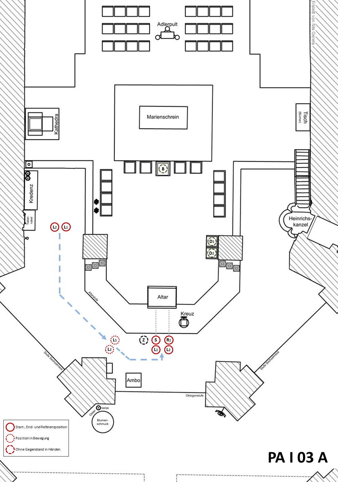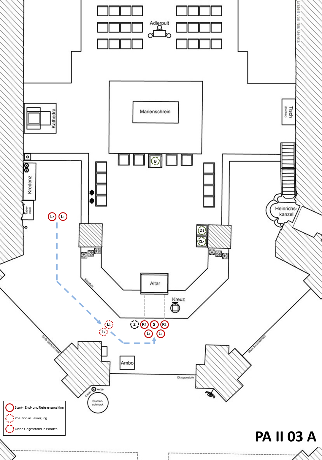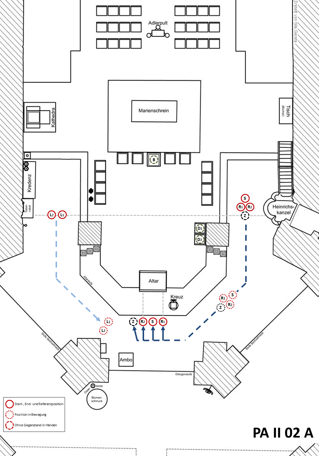 Nach Beendigung der zweiten Lesung erhebt sich die Weihrauchgruppe und geht zusammen mit dem Zeremoniar zum Rauchfassständer unter der Heinrichskanzel. Sofern nicht bereits beim Antwortgesang erfolgt, werden die Kohlen von Asche befreit, bevor Rauchfass und Schiffchen aufgenommen werden. Die Weihrauchgruppe stellt sich hinter dem Zeremoniar auf und wartet auf das Startzeichen für den Gang zum Altar. Bei der Verwendung von zwei Rauchfässern steht der Schiffchenträger hinter den beiden Rauchfassträgern, bei der Verwendung eines Rauchfasses direkt links neben dem Rauchfassträger.