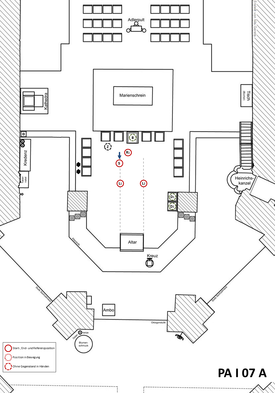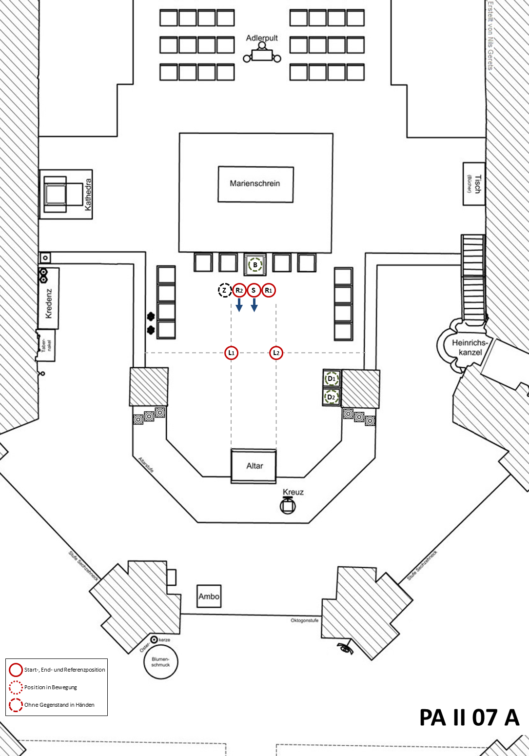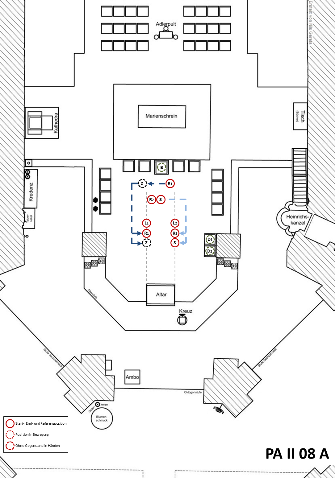 Nach dem Einlegen tritt die gesamte Weihrauchgruppe einen kleinen Schritt zurück und macht eine Verneigung (Reverenz). Daraufhin tritt der Schiffchenträger (ggf. gemeinsam mit dem zweiten Rauchfassträger) einen weiteren Schritt zurück, wodurch zum Rauchfassträger (mit Inzensfass) ein Abstand entsteht. Nun drehen sich Rauchfassträger (mit Inzensfass) und Zeremoniar sowie Schiffchenträger (und ggf. zweiter Rauchfassträger) um 90 Grad und gehen dann hintereinander außen an den Leuchterträger vorbei halbkreisförmig zu ihren Positionen auf der Altarinsel (vgl. Skizze). Die Ministranten bilden dabei eine Art Spalier, indem sie zueinander ausgerichtet stehen und sich paarweise ansehen können (ad invicem).